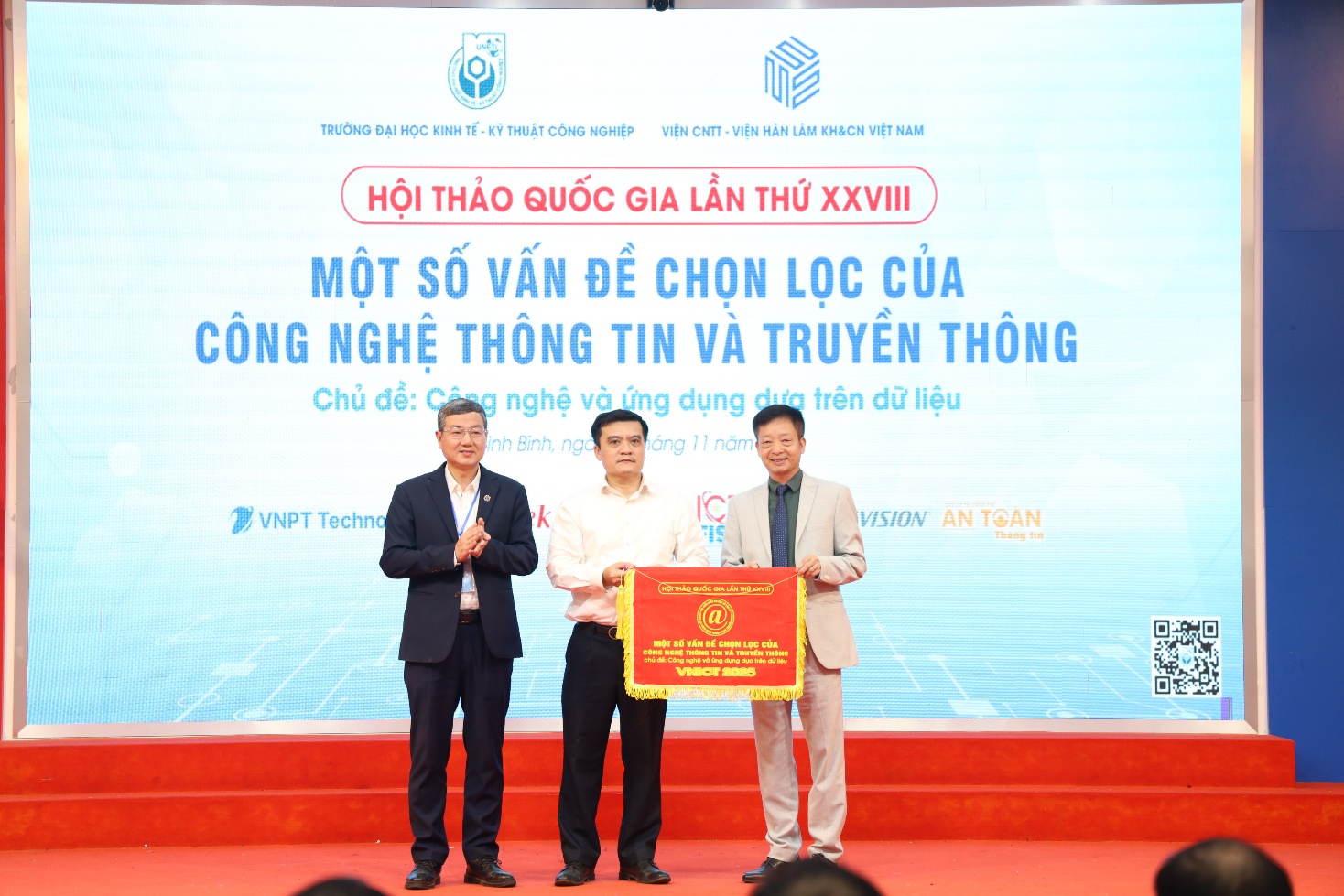 TS. Trần Hoàng Long – Hiệu trưởng trường Đại học Kinh tế – Kỹ thuật Công nghiệp và PGS.TS. Nguyễn Trường Thắng – Viện Trưởng Viện CNTT – Viện Hàn lâm KHCN Việt Nam trao cờ đăng quang tổ chức Hội thảo VNICT tiếp theo (lần thứ 29) cho TS. Lương Ngọc Minh – Phó Hiệu trưởng, Trường Đại học Hà Nội.